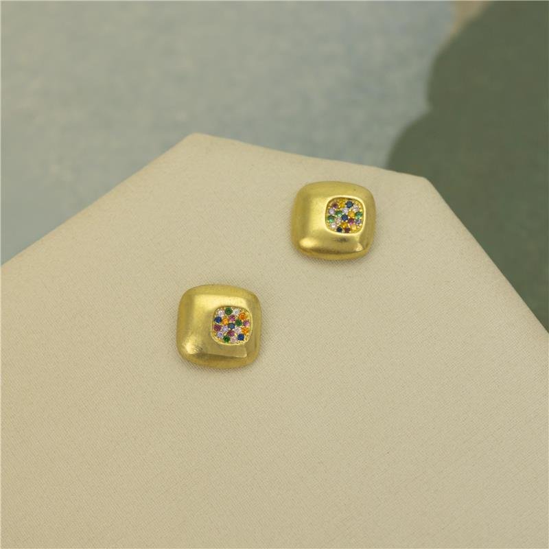 Brinco fixo quadrado cravejado de zircônias multicolor. Produto no bruto.Produtos no bruto não passaram pelo processo de galvanoplastia, o banho. Falta em sua superfície a camada de metais preciosos como ouro, prata e ródio.