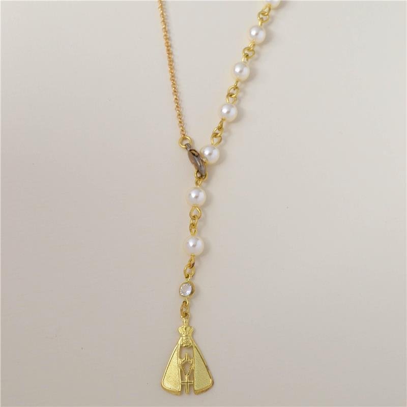 Colar 50cm corrente elo português com pérolas 6mm, zircônia 4mm cristal e Nossa Senhora Aparecida vazada. Produto no bruto.Produtos no bruto não passaram pelo processo de galvanoplastia, o banho. Falta em sua superfície a camada de metais preciosos como ouro, prata e ródio.
