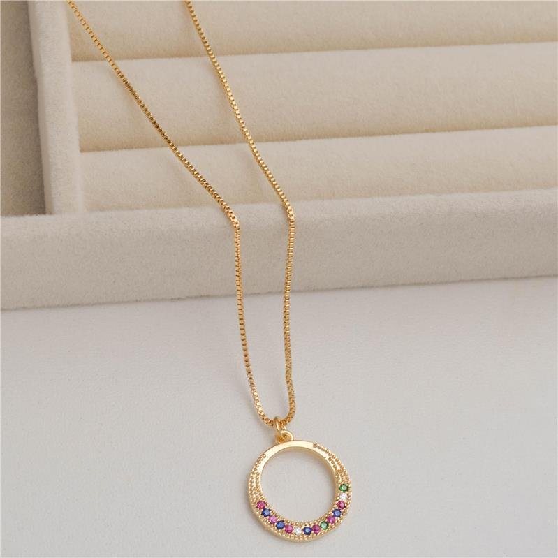 Colar 45cm corrente veneziana com aro cravejado zircônias multicolor. Produto no bruto.Produtos no bruto não passaram pelo processo de galvanoplastia, o banho. Falta em sua superfície a camada de metais preciosos como ouro, prata e ródio.