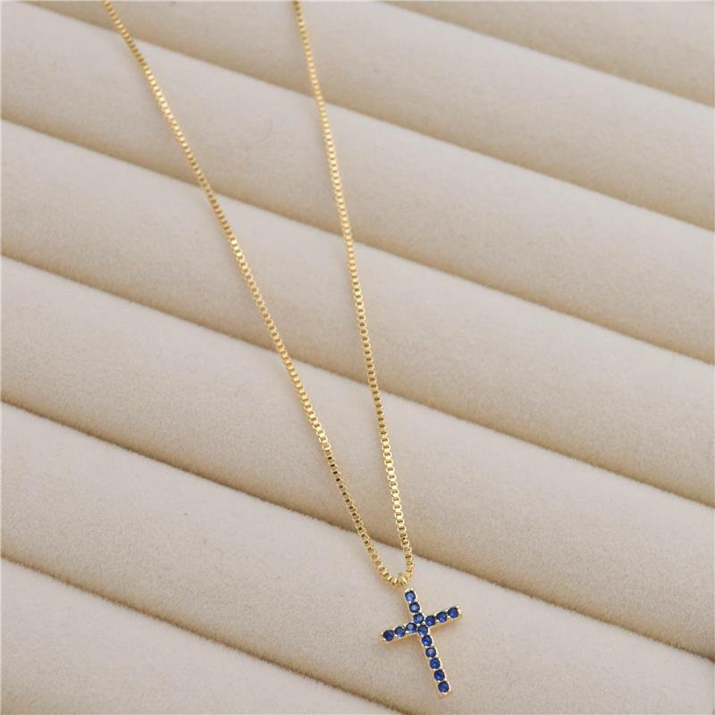 Colar 40cm na veneziana com pingente de cruz cravejado de micro zircônia na cor capri blue. Produto no bruto.Produtos no bruto não passaram pelo processo de galvanoplastia, o banho. Falta em sua superfície as camadas de metais preciosos como ouro, prata ou ródio.