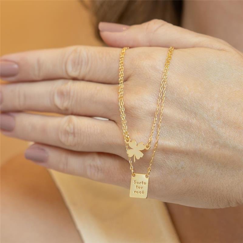 Colar escapulário corrente cartier com plaquinha escrito Sorte Ter Você e trevo de quatro folhas. Produto no bruto.Produtos no bruto não passaram pelo processo de galvanoplastia, o banho. Falta em sua superfície a camada de metais preciosos como ouro, prata e ródio.