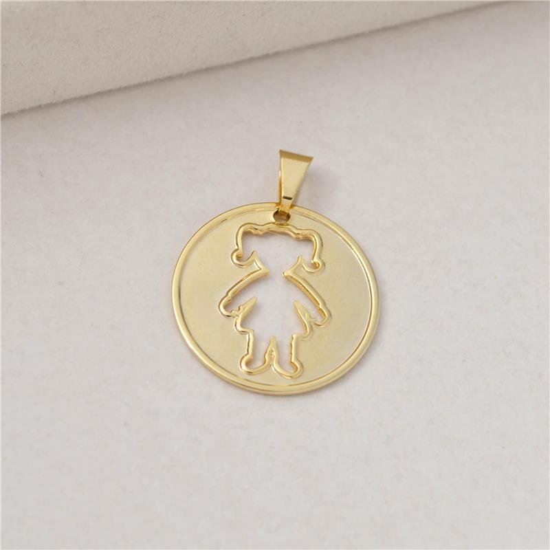 Pingente medalha vazada com menina. Produto no bruto.Produtos no bruto não passaram pelo processo de galvanoplastia, o banho. Falta em sua superfície as camadas de metais preciosos como ouro, prata ou ródio.