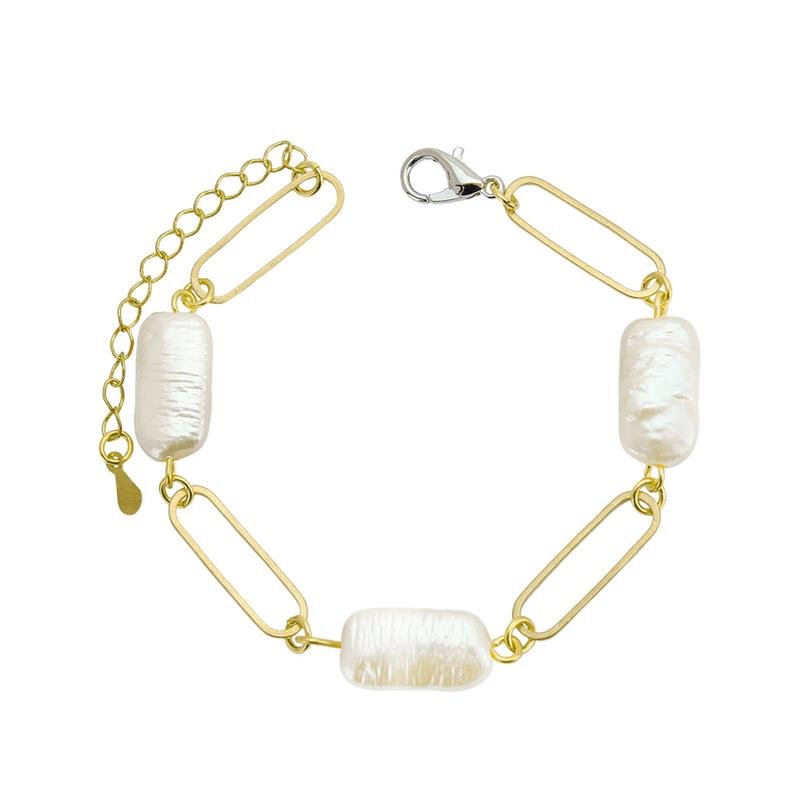 Pulseira corrente de elos retangulares com pérolas retangulares trabalhadas. Produto no bruto.Produtos no bruto não passaram pelo processo de galvanoplastia, o banho. Falta em sua superfície a camada de metais preciosos como ouro, prata e ródio.
