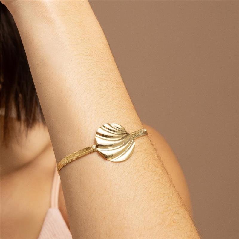 Pulseira corrente fita 4mm com acessório redondo de textura ondulada 23mm. Produto no bruto.Produtos no bruto não passaram pelo processo de galvanoplastia, o banho. Falta em sua superfície a camada de metais preciosos como ouro, prata e ródio.