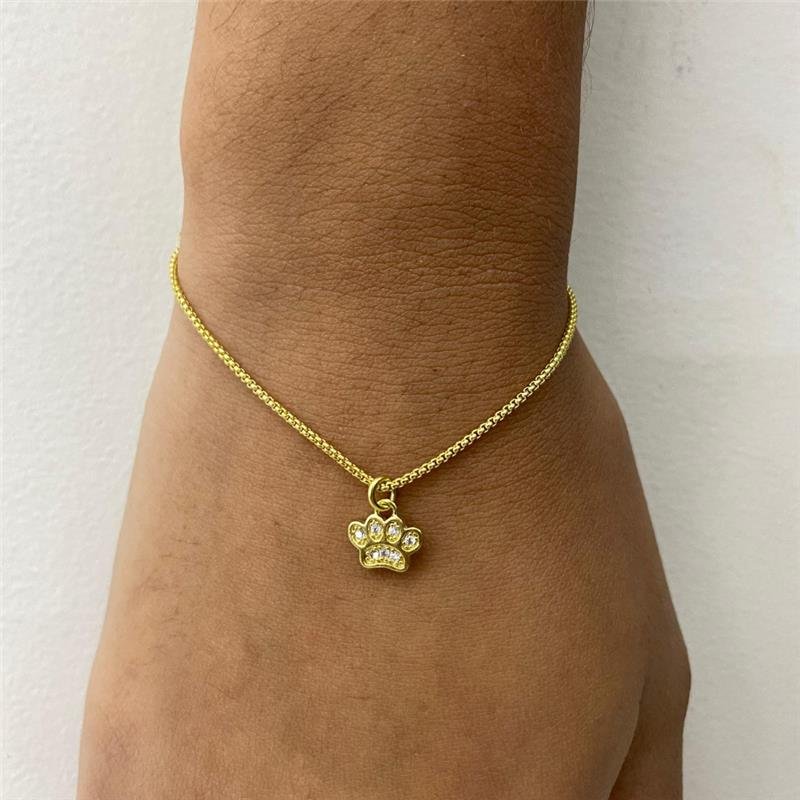 Pulseira corrente veneziana redonda 1mm com pingente pata de cachorro cravejada de zircônias na cor cristal. Produto no bruto.Produtos no bruto não passaram pelo processo de galvanoplastia, o banho. Falta em sua superfície a camada de metais preciosos como ouro, prata e ródio.
