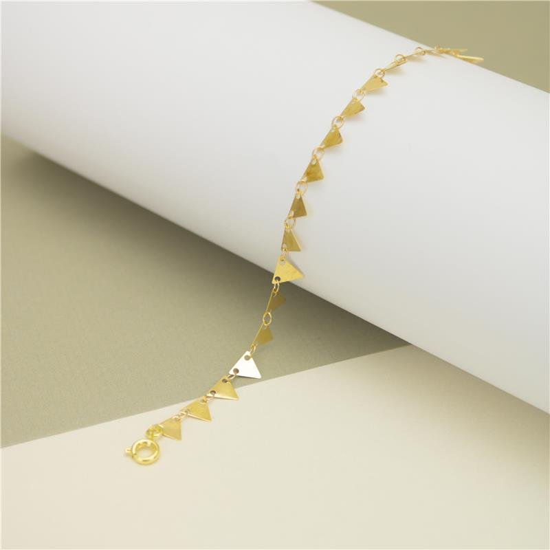 Tornozeleira corrente de chapinhas em formato de triângulo. Produto no bruto.Produtos no bruto não passaram pelo processo de galvanoplastia, o banho. Falta em sua superfície as camadas de metais preciosos como ouro, prata ou ródio.